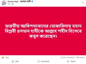 ওসমান হাদির ভেরিফায়েড ফেসবুক পেইজে লেখা হয়েছে, ভারতীয় আধিপত্যবাদের মোকাবিলায় মহান বিপ্লবী ওসমান হাদিকে আল্লাহ শহীদ হিসেবে কবুল করেছেন।
