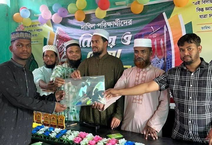 নিজস্ব প্রতিবেদক :: সুনামগঞ্জ জেলার শান্তিগঞ্জ উপজেলার দামোধরতপী মাহমুদপুর দাখিল মাদ্রাসার ২০২৬ খ্রি: এর দাখিল পরীক্ষার্থীদের বিদায় ও দোয়া মাহফিল অনুষ্ঠিত হয়েছে। বৃহস্পতিবার (১৬ এপ্রিল) সকাল ১১ টায় মাদ্রাসার হল রোমে অত্র মাদ্রাসার ম্যানেজিং কমিটির সভাপতি সাংবাদিক কাজী মোহাম্মদ জমিরুল ইসলাম মমতাজের সভাপতিত্বে, সহকারী সিনিয়র শিক্ষক মো. আলী হোসেনের পরিচালনায় অনুষ্ঠানে বক্তব্য রাখেন অত্র মাদ্রাসার সুপার মাওলানা শহীদুল ইসলাম চৌধুরী, মাদ্রাসা ম্যানেজিং কমিটির অভিভাবক সদস্য সাইফুল ইসলাম, জুয়েল রানা, অত্র মাদ্রাসার সহ শিক্ষক মো. ইয়াকুব আলী, সহ শিক্ষক বেলাল আবেদীন, জুনিয়র শিক্ষক কামরুজ্জামান, ইক্বরা ক্যাডেট মাদ্রাসার সহ শিক্ষক মাওলানা শাহ আলম, ১০ম শ্রেণীর ছাত্র নবীবুর রহমান, পরীক্ষার্থী সুমাইয়া ছিদ্দিকা, মাসুমা আক্তার সহ প্রমূখ। অনুষ্ঠান শেষে সকল পরীক্ষার্থীদের সফলতার জন্য মোনাজাত করেন সুপার মাওলানা শহীদুল ইসলাম চৌধুরী।