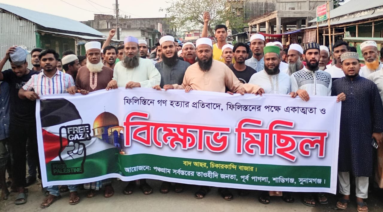 শান্তিগঞ্জে পূর্ব পাগলা ইউনিয়নে ইসরাইলে হামলার প্রতিবাদে বিক্ষোভ মিছিল ও প্রতিবাদ সমাবেশ