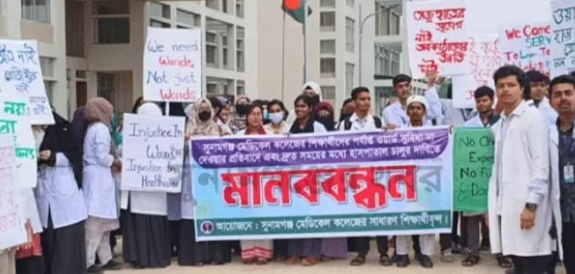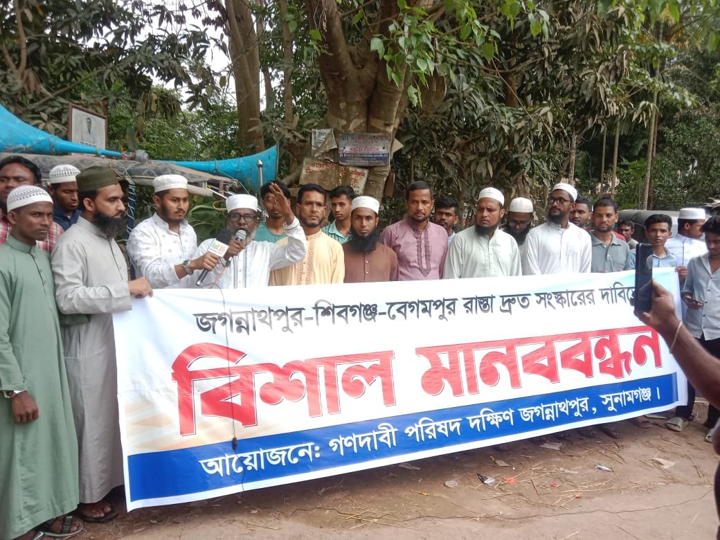 জগন্নাথপুর- শিবগঞ্জ-বেগমপুর রাস্তা দ্রুত সংস্কারের দাবীতে বিশাল মানববন্ধন