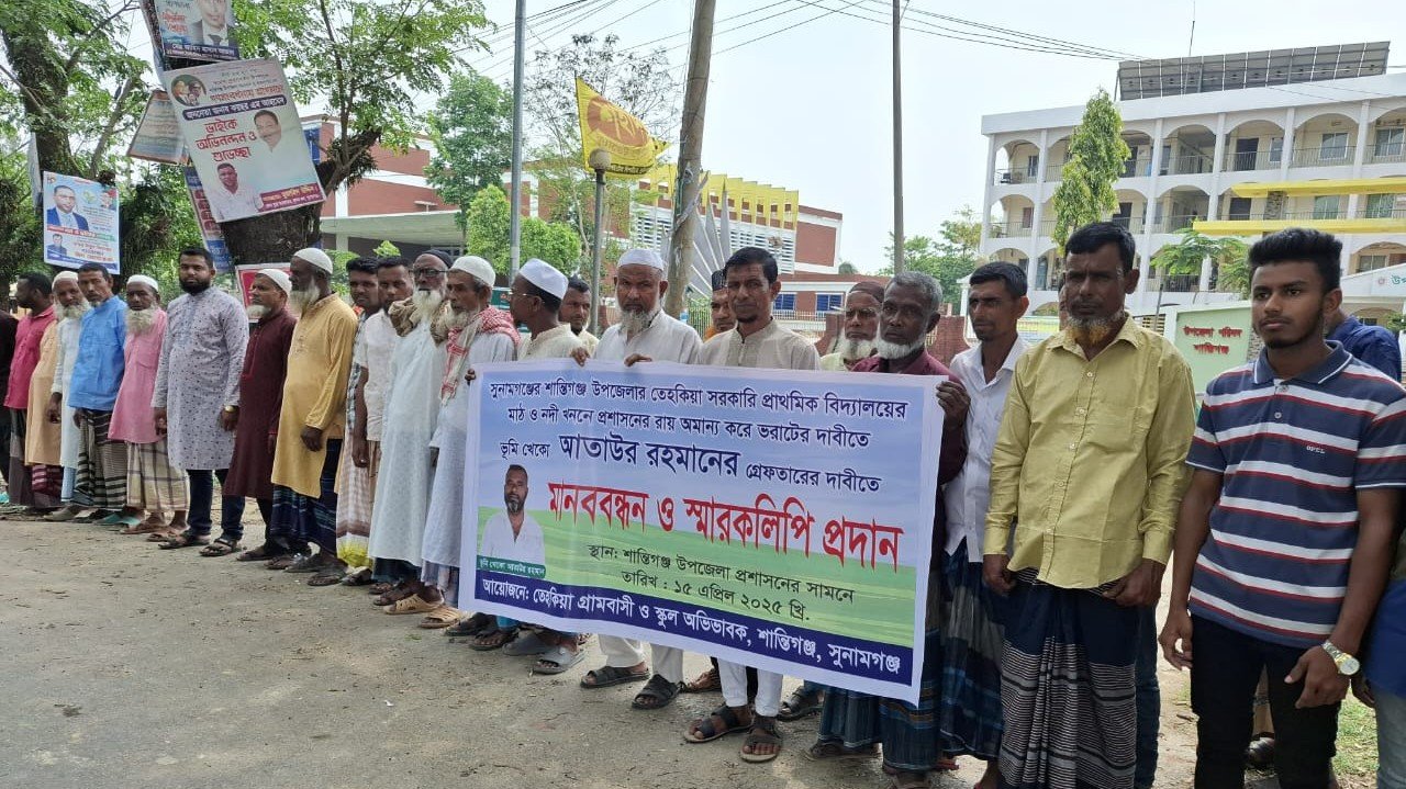 শান্তিগঞ্জে অবৈধ ভাবে স্কুলের মাঠ ও নদী খননকারী ভূমিখেকো আতাউর ও তার সহযোগীদের বিরুদ্ধে মানববন্ধন ও স্মারকলিপি প্রদান