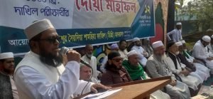 ইয়াকুব মিয়া :: সুনামগঞ্জের জগন্নাথপুর উপজেলার সৈয়দপুর সৈয়দিয়া শামছিয়া ফাজিল মাদরাসায় এলাকার সকল মুর্দেগান, বিশেষ করে ১২০ বছরে ঐতিহ্যবাহী শিক্ষা প্রতিষ্ঠানের শুরু থেকে এ পর্যন্ত কায়িক, মানবিক ও আর্থিক সহযোগিতাকারীদের রূহের মাগফিরাত কামনায় এক দোয়া মাহফিলের আয়োজন করা হয়। সোমবার (১২ ফেব্রুয়ারী) সকাল সাড়ে ১১ টায় মাদ্রাসার মাঠে সৈয়দপুর দারুল হাদীস মাদরাসার মুহতামীম হাফিজ মাওলানা সৈয়দ ফখরুল ইসলামের সভাপতিত্বে ও প্রভাষক মাওলানা নিজাম উদ্দিনের পরিচালনায় প্রধান অতিথি শায়খুল হাদীস আল্লামা মুফতি নজরুল ইসলাম কাসেমী বলেন, মানুষ সৃষ্টির শ্রেষ্ঠ জীব। মহানবী হযরত মুহাম্মদ (সা.) শ্রেষ্ঠ নবী, তাঁর উম্মত সকল উম্মতের শ্রেষ্ঠ। তিনি আফসোস করে বলেন; প্রিয় নবীজির আদর্শ অনুসরণ না করে তাঁর উম্মতগণ আজ বিজাতীয় কৃষ্টি-কালচারে নিমজ্জিত নিজেদের ধ্বংসের দিকে ধাবিত হচ্ছে। তিনি উপস্থিত সকলকে মা-বাবার জন্য প্রতিদিন কমপক্ষে একবার হলেও দুআ’য় স্মরণ করে নসীহত করেন। মাহফিলে স্বাগত বক্তব্য রাখেন মাদরাসা অধ্যক্ষ ড. হাফিজ মাওলানা সৈয়দ রেজওয়ান আহমদ। এর পূর্বে সকাল ১০টা থেকে দাখিল পরীক্ষার্থীদের জন্য দোয়া ও সৈয়দপুর শামছিয়া সমিতি লন্ডনের পক্ষ থেকে অনুদান এবং কলম প্রদান আয়োজন মাদরাসার অধ্যক্ষ ড. সৈয়দ রেজওয়ান আহমদের সভাপতিত্বে অনুষ্ঠিত হয়।