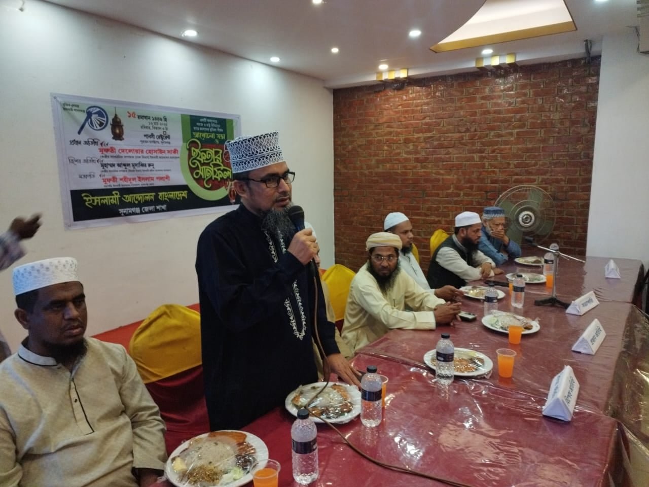 আল হেলাল, সুনামগঞ্জ :: সুনামগঞ্জে আগামী দিনে ইসলামী রাষ্ট্র প্রতিষ্ঠার ধারাবাহিক আন্দোলনের সার্বিক সাফল্য কামনা করে ইসলামী আন্দোলন বাংলাদেশ এর জেলা কমিটির উদ্যোগে ইফতার মাহফিল সম্পন্ন হয়েছে। রবিবার (১৬ মার্চ) বিকেলে স্থানীয় পুরাতন বাসস্ট্যান্ডস্থিত পানসী রেষ্টুরেন্টে এই ইফতার মাহফিল অনুষ্ঠিত হয়। ইসলামী আন্দোলন জেলা শাখার সভাপতি মুফতি শহিদুল ইসলাম পলাশীর সভাপতিত্বে ও সাধারণ সম্পাদক মাওলানা সোহেল আহমদ এর পরিচালনায় অনুষ্ঠিত ইফতার পূর্ববর্তী আলোচনা সভায় প্রধান অতিথির বক্তব্য রাখেন কেন্দ্রীয় কমিটির সাংগঠনিক সম্পাদক মুফতী দেলোয়ার হোসাইন সাকী। বিশেষ অতিথির বক্তব্য রাখেন ইসলামী আন্দোলন কেন্দ্রীয় কমিটির সাংগঠনিক সম্পাদক মোহাম্মদ আব্দুল মুসাব্বির রুনু,ইসলামী ফাউন্ডেশনের উপ-পরিচালক কৃষিবিদ মোশাররফ হোসেন ও জেলা জামায়াতের আমীর উপাধ্যক্ষ তোফায়েল আহমদ খান। এ সময় জেলা জামায়াতের নায়েবে আমীর মোমতাজুল হাসান আবেদ, সাধারণ সম্পাদক অধ্যাপক মোঃ আব্দুল্লাহ, জেলা জমিয়তুল উলামায়ে ইসলামের সাধারণ সম্পাদক মাওলানা তৈয়্যিবুর রহমান চৌধুরী, জমিয়তের (মুফতি ওয়াক্কাস) সভাপতি মাওলানা আব্দুস শহীদ জামলাবাদী, জেলা সেক্রেটারী হাফেজ রশিদ আহমদ, জেলা হেফাজতের সাধারণ সম্পাদক মুফতি আব্দুল হক আহমদী, এবি পার্টির আহবায়ক মোঃ জসীম উদ্দিন, সুনামগঞ্জ জেলা বাংলাদেশ খেলাফত মজলিসের সাধরন সম্পাদক হাফিজ সৈয়দ জয়নুল ইসলাম, সুনামগঞ্জ প্রেসক্লাবের সিনিয়র সহ-সভাপতি আল হেলাল, সহ সাধারণ সম্পাদক মোঃ বাবুল মিয়া, জাতীয় সাংবাদিক সংস্থার সাংগঠনিক সম্পাদক রাজু আহমেদ রমজান, সাংবাদিক এম.আর সজিব, জেলা বৈষম্য বিরোধী আন্দোলনের আহবায়ক ইমন দ্দোজা আহমদ,সদস্য সচিব মেহেদী হাসান সাকিব,সমন্বয়ক শাহনূর আহমদ,ওয়ারী অব জুলাই এর আহবায়ক মোঃ ফয়ছল আহমদ, আন্দোলনে আহত মোঃ জহুর আলী ও আহত সাংবাদিক মোঃ আফতাব উদ্দিন প্রমুখ উপস্থিত ছিলেন। এছাড়াও জেলা পর্যায়ের কর্মকর্তাবৃন্দ, রাজনীতিবিদ, সাংবাদিক, আইনজীবী ও জুলাই বিপ্লবে আহত বিপ্লবীসহ বিভিন্ন শ্রেণি পেশার লোকজন ইফতার মাহফিলে অংশ নেন। ইফতারের আগে দেশ ও জাতির কল্যাণ কামনায় বিশেষ মুনাযাতে অংশ নেন সমবেত অতিথি ও মুসল্লীয়ানগন।