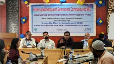 নিজস্ব প্রতিবেদক :: সুনামগঞ্জ জেলার শান্তিগঞ্জে *এফ্যারটস ফর রুরাল এডভ্যান্সমেন্ট( ইরা)* র সুনামগঞ্জ কর্তৃক বাস্তবায়িত মিউচুয়াল লার্নিং ফর ইমপ্রুভিং হেলথ এন্ড নিউট্রিশন সিনারিও” প্রকল্পের দ্বিতীয় রাউন্ডের সমাপনী সভা অনুষ্ঠিত হয়েছে। মঙ্গলবার (২৮ অক্টোবর) সকাল সাড়ে ১১ টায় এনজিও সংস্থা এফ্যারটস ফর রুরাল এডভ্যান্সমেন্ট ইরা’র আয়োজনে, নরওয়েজিয়ান এজেন্সি ফর এক্সচেঞ্জ কোঅপারেশন (এনওআরইসি) অর্থায়নে, উপজেলা পরিষদের কনফারেন্স রুমে, উপজেলা ৫০ শয্যা হাসপাতালের মেডিকেল অফিসার ডা. তারিক জামিল অপু’র সভাপতিত্বে, ইরা’র সুনামগঞ্জের মনিটরিং এন্ড ইভ্যালুয়েশন অফিসার, মোঃ ফজলুল করিম’র সঞ্চালনায় সভায় প্রধান অতিথি’র বক্তব্য দেন, শান্তিগঞ্জ উপজেলা নির্বাহী কর্মকর্তা সুকান্ত সাহা। সভায় বিশেষ অতিথির বক্তব্য দেন, উপজেলা প্রাথমিক শিক্ষা কর্মকর্তা সেলিম খান, উপজেলা যুব উন্নয়ন কর্মকর্তা সন্দ্বীপ বিশ্বাস, উপজেলা প্রকল্প বাস্তবায়ন কর্মকর্তা জাহাঙ্গীর আলম, সমবায় কর্মকর্তা রুহুল হাসান, শান্তিগঞ্জ প্রেসক্লাবের সভাপতি কাজী মোহাম্মদ জমিরুল ইসলাম মমতাজ। সভায় আরও বক্তব্য দেন, ইরার নিউট্রিশন অফিসার লিমা আক্তার, ইরার মেডিকেল অফিসার ডা. সামিহা সুলতানা, ইরা’র নিউট্রিশন অফিসার সাবিহা, ইরা’র মেডিকেল অফিসার ডা. তানিয়া আক্তার, সাতগাঁও জিবদাড়া উচ্চ বিদ্যালয়ের প্রধান শিক্ষক নোমান আহমেদ, গনিনগর ষোলগ্রাম উচ্চ বিদ্যালয়ের স্টুডেন্ট ফোরামের সভাপতি রুহিতা বেগম, সাতগাঁও জিবদাড়া উচ্চ বিদ্যালয়ের স্টুডেন্ট ফোরামের সভাপতি নাজিয়া আক্তার, সংবাদকর্মী আবু সাঈদ, শিমুলবাক ইউনিয়ন পরিষদের প্রশাসনিক কর্মকর্তা হান্নান মিয়া, সিএইচসিপি আজিজুর রহমান, স্বেচ্ছাসেবী সুহেনা আক্তার সহ প্রমূখ।