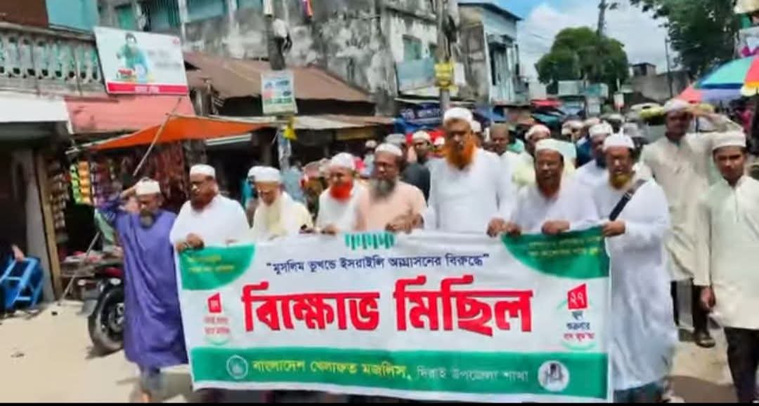 মুসলিম ভূখন্ডে ইসরাইলি আগ্রাসনের প্রতিবাদে বাংলাদেশ খেলাফত মজলিস দিরাই উপজেলার বিক্ষোভ মিছিল