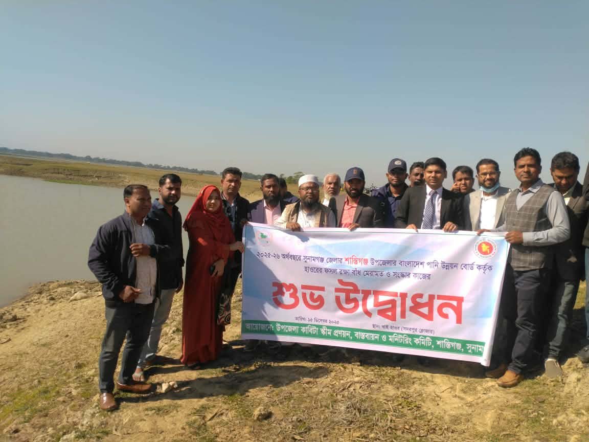 শান্তিগঞ্জে হাওরে ফসল রক্ষা বাঁধের কাজের উদ্বোধন