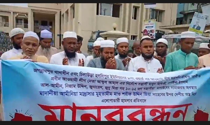 জগন্নাথপুরে মাদ্রাসার প্রধানকে বেঁধে নিয়ে মারধর, পুলিশ গিয়ে উদ্ধার, এলাকায় মানববন্ধন