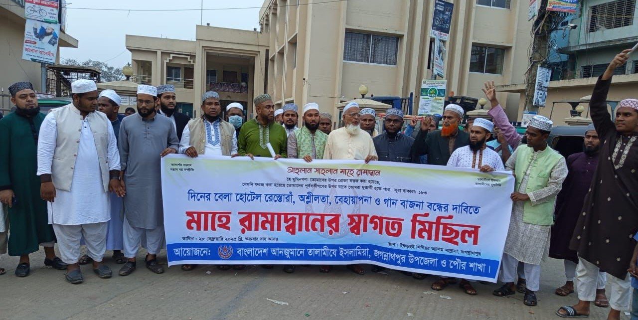 জগন্নাথপুরে মাহে রমজানের পবিত্রতা রক্ষার আহবানে আনজুমানে তালামীযে ইসলামিয়ার স্বাগত মিছিল