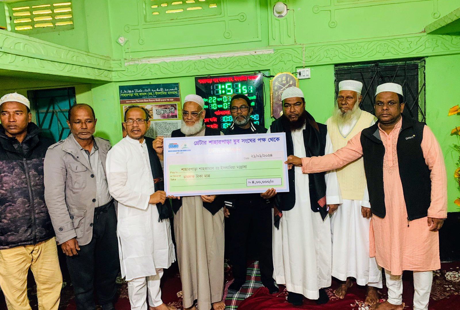 জগন্নাথপুরে শাহারপাড়া মাদ্রাসায় গ্রেটার শাহারপাড়া যুব সংঘের ৪ লক্ষ টাকার চেক হস্তান্তর