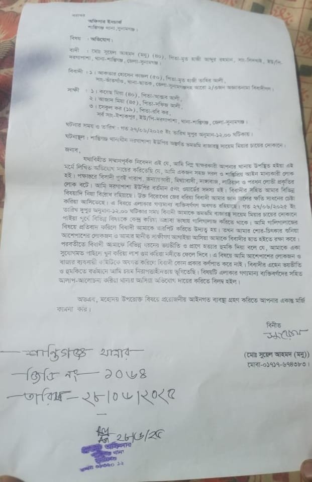 নিজস্ব প্রতিবেদক :: সুনামগঞ্জের শান্তিগঞ্জে হত্যার হুমকিতে নিজের নিরাপত্তা চেয়ে থানায় সাধারণ ডায়েরি (জিডি) করেছেন এক ইউপি সদস্য। শনিবার ছাতক