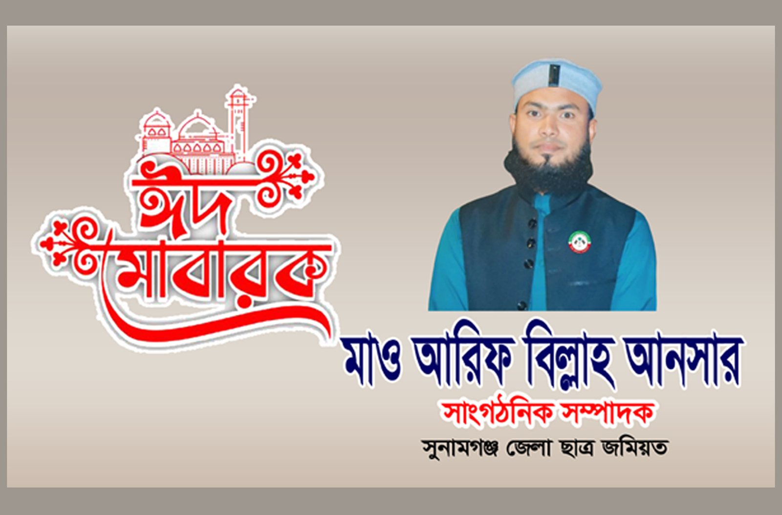 সুনামগঞ্জ জেলা ছাত্র জমিয়তের সাংগঠনিক সম্পাদক মাও. আরিফ বিল্লাহ আনসারের ঈদ শুভেচ্ছা