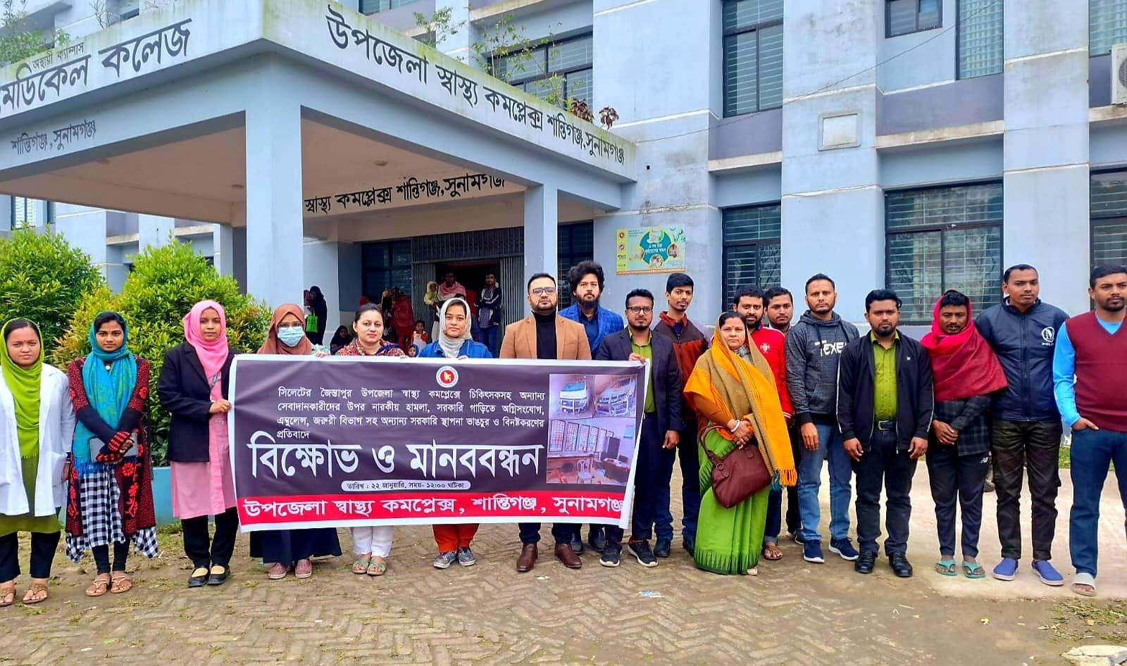 শান্তিগঞ্জে চিকিৎসক- কর্মচারীদের বিক্ষোভ ও মানববন্ধন