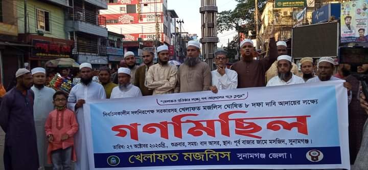 খেলাফত মজলিস ঘোষিত দলনিরপেক্ষ নির্বাচনকালীন সরকারসহ ৮ দফা দাবি আদায়ের লক্ষ্যে কেন্দ্রীয় কর্মসূচির অংশ হিসেবে সুনামগঞ্জ জেলা শাখার উদ্যোগে গণ